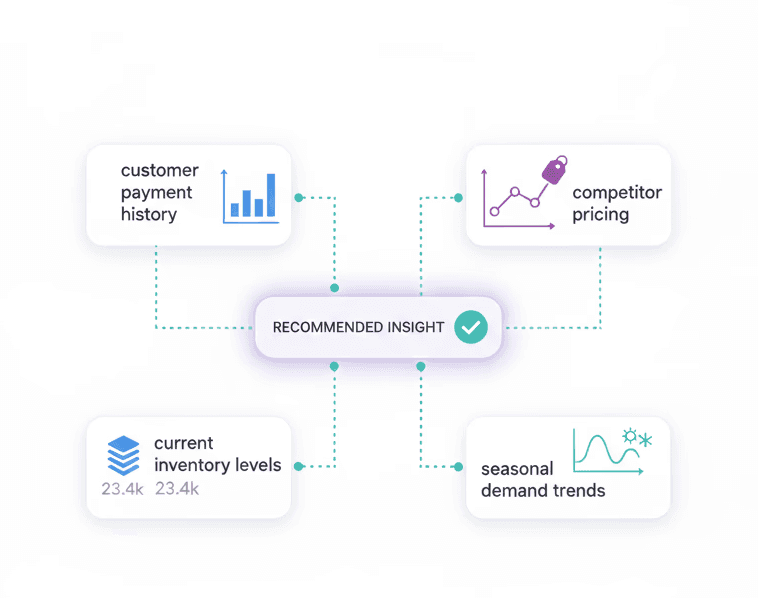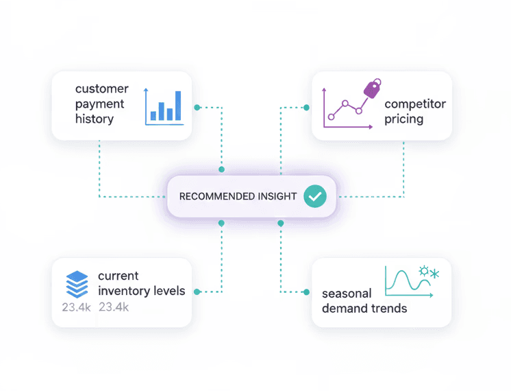 Customer's payment history, current inventory levels, competitor pricing, seasonal demand patterns — all synthesized into actionable recommendations in milliseconds. No more guessing. No more gut feelings.