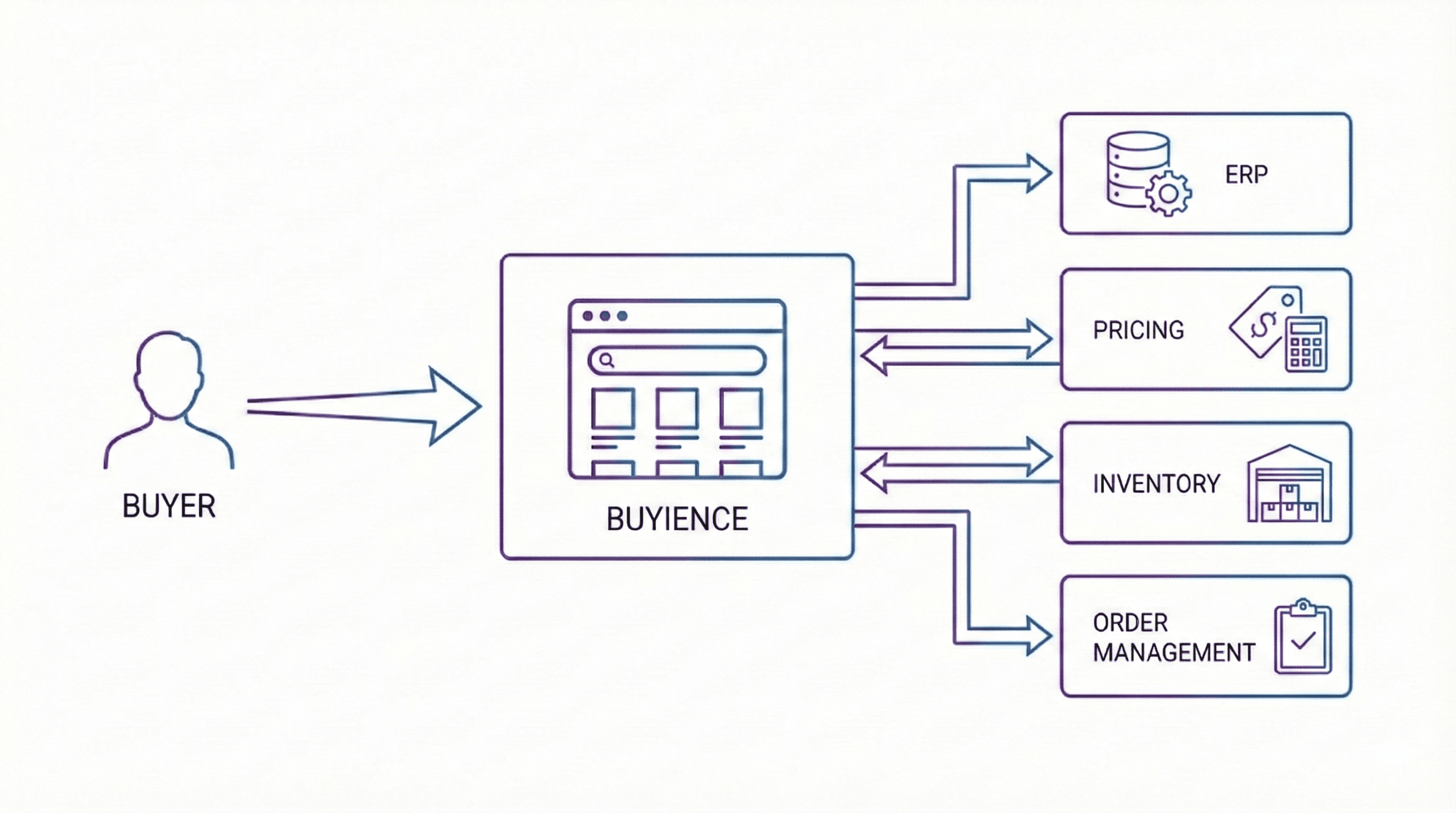 Buyience adds B2B functionality on top, focusing on quote-to-order processes, CPQ for configurable products, customer-specific pricing that handles contract rates and volume tiers, and sales-assisted buying where representatives and customers collaborate on orders.