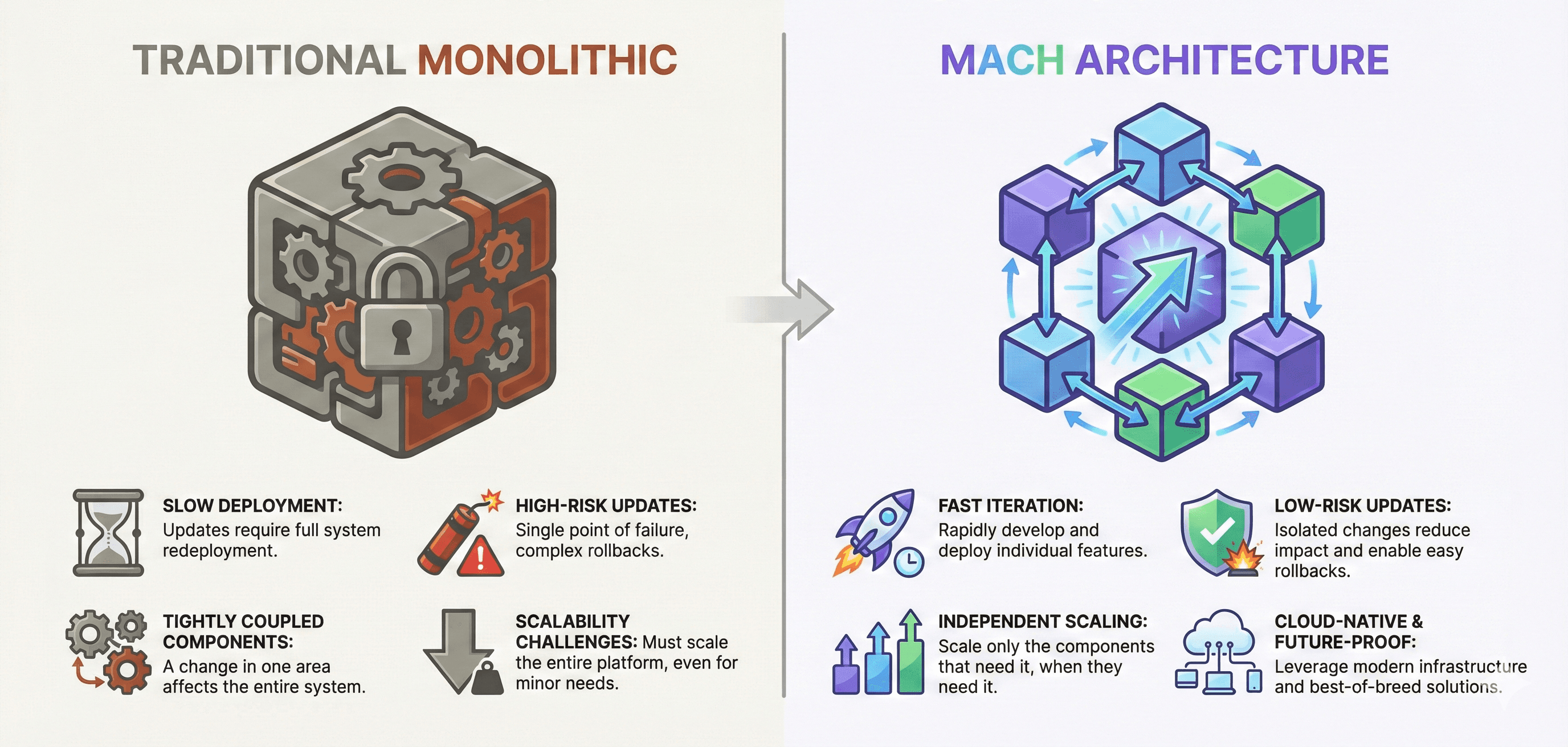 Monolithic platforms require coordinated releases, making development slower and riskier. MACH architectures allow independent deployments, enabling teams to ship improvements without waiting on unrelated changes.