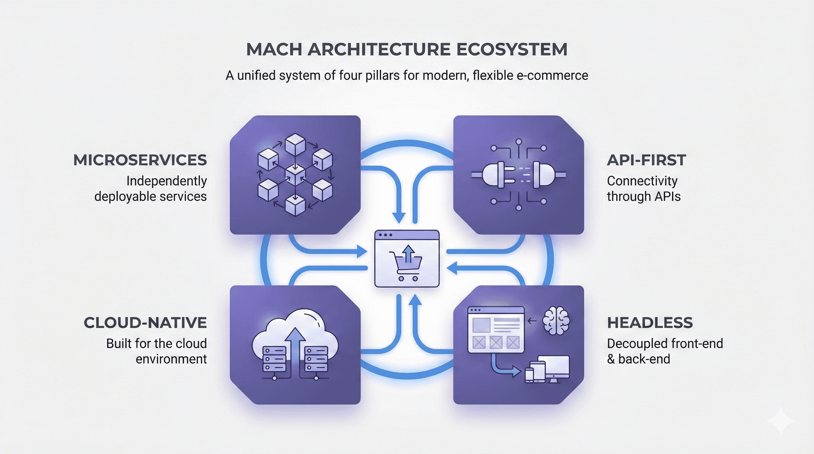 Without MACH principles, composable commerce introduces integration complexity and operational risk. MACH architecture establishes consistent standards—microservices, APIs, cloud-native infrastructure, and headless separation—that allow components to work together reliably.
