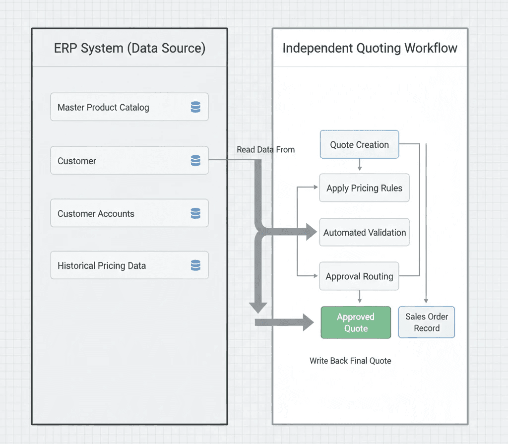 The ERP remains the system of record. Quoting remains the system of execution. Confusing the two is how manual workarounds are born.