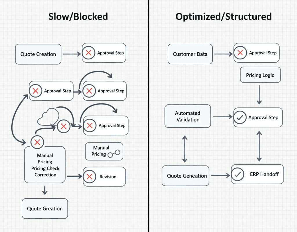 Not deals you clearly lose — deals that leak out of the funnel. A buyer is ready, pricing is close, but a small exception requires approval. The approver is traveling. The approval sits. The buyer goes with a competitor who responded in 48 hours. In the CRM, it’s logged as a competitive loss. In reality, it was a quoting workflow failure.