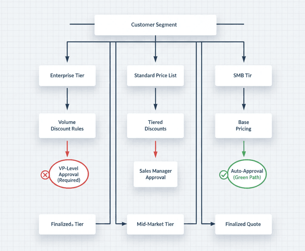 Ops teams answering Slack questions about price tiers. Finance reviewing routine discounts. Sales managers approving deals they don’t actually need to review. Highly paid people become human middleware because the quoting process has no system-level logic.