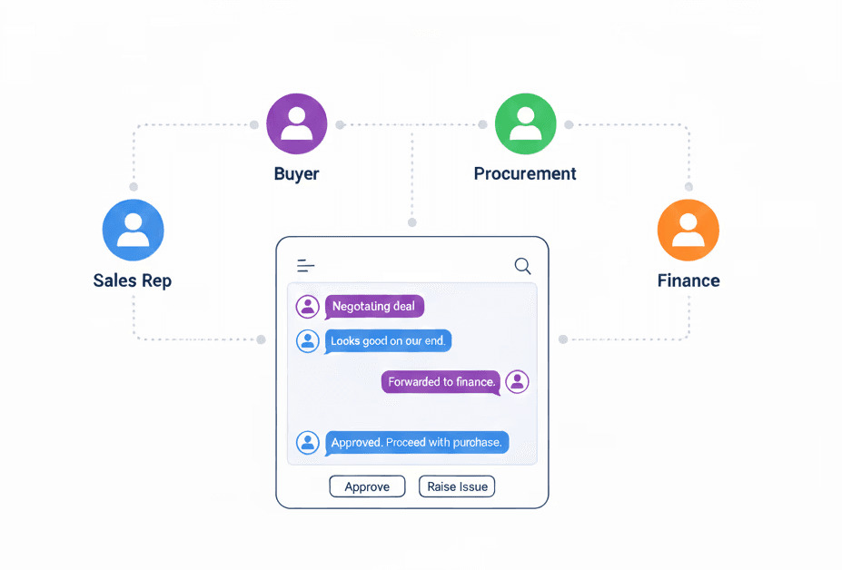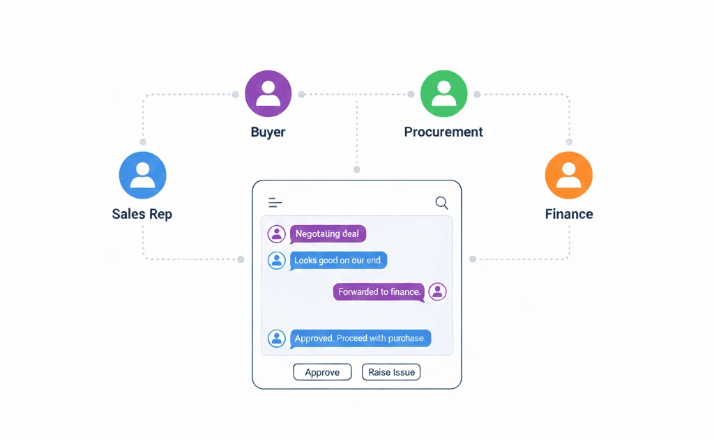 Invite colleagues, managers, or procurement teams. Everyone sees the same conversation. Approvals happen in-thread.