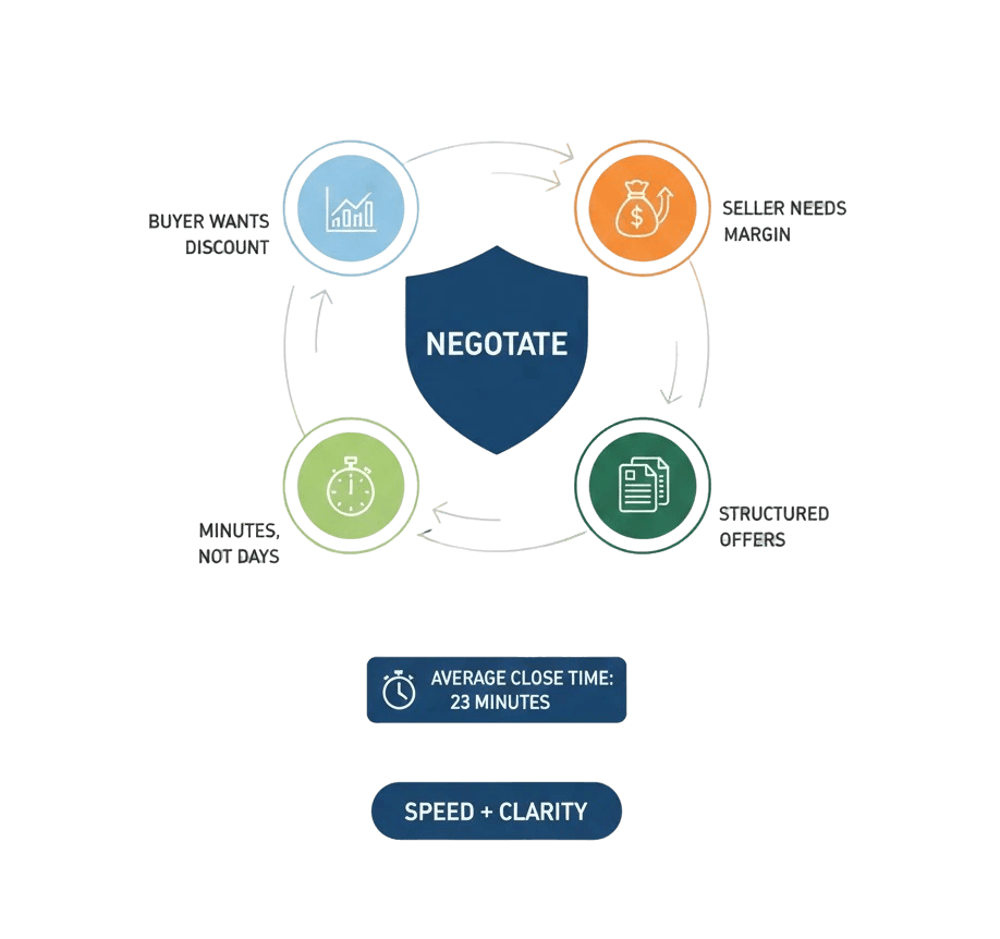Buyer wants a discount. Seller needs margin. Back-and-forth happens in minutes, not days. Structured offer cards make every proposal crystal clear.