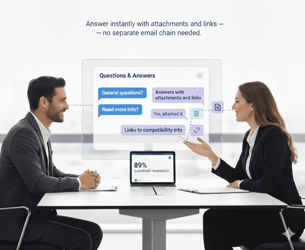 Buyer has questions about specs, compatibility, or lead times. Answer instantly with attachments and links — no separate email chain needed.