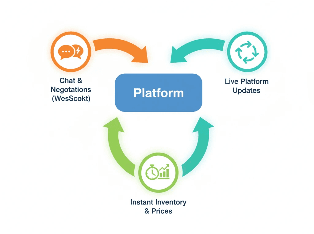 Live updates across the platform. WebSocket integration for chat and negotiations. Instant inventory and price updates.