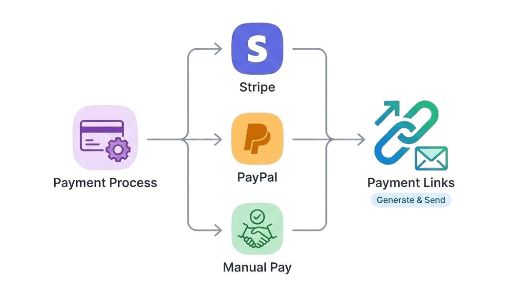 Stripe, PayPal, and manual options cover every scenario.