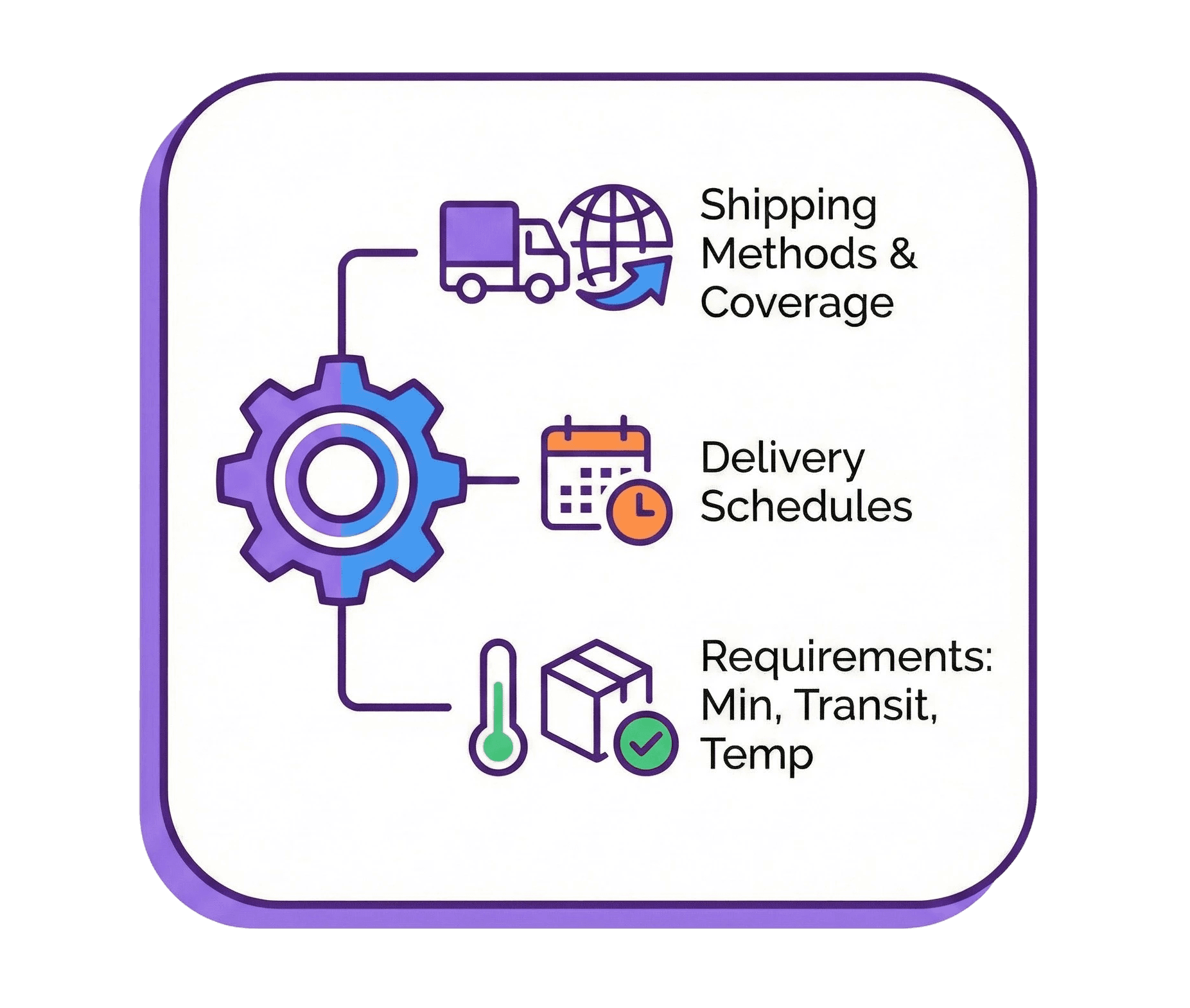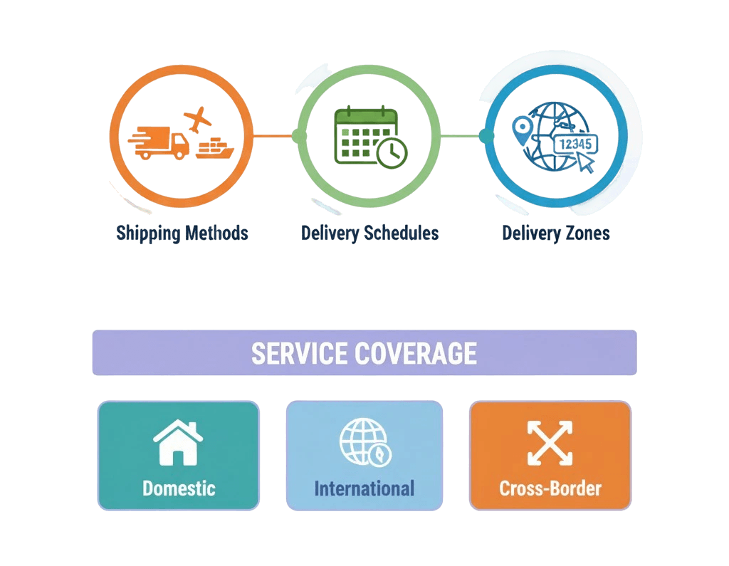Define shipping methods, service coverage, and delivery schedules for each supplier. Set up delivery zones with specific postal codes and special instructions.