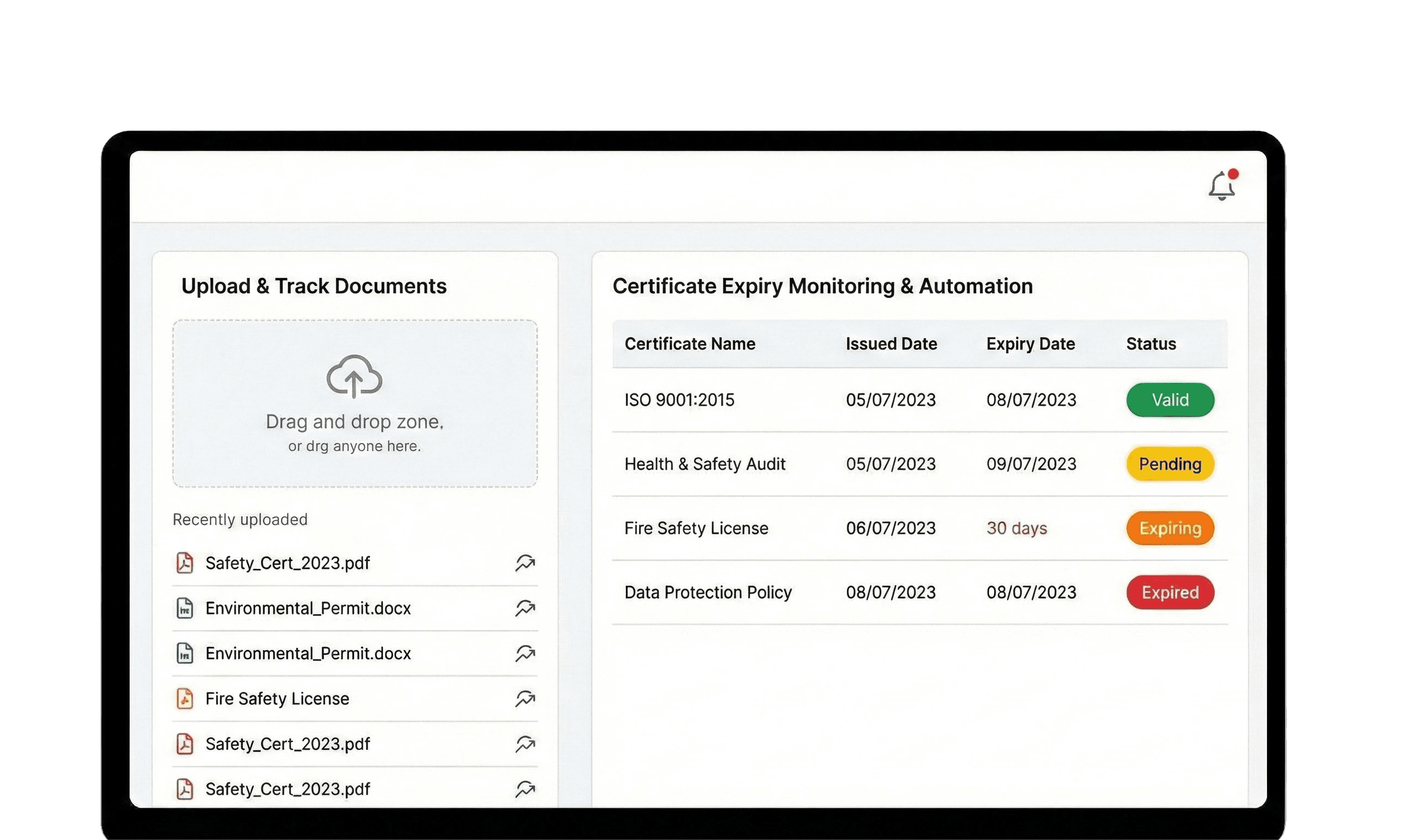Upload compliance documents (PDF). Track issue dates, expiry dates, and verification status. The system automatically calculates certificate status based on dates.